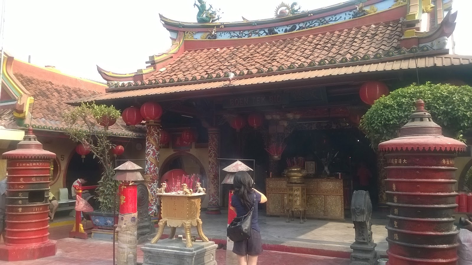 Patung naga itu bertengger di atas bangunan klasik sebuah klenteng dan tidak tau mengapa tiba-tiba saya sangat tertarik dengan klenteng ini yaitu klenteng boen tek bio. Waktu itu saya hanya beniatan untuk menyusuri sungai Cisadane saja dan melwati pasar Tangeran lama, berkelak kelok dan berhimpitan dengan para pedagang dan pembeli. Tak jauh dari situ tepatnya di pertigaan jalan yang tidak terlalu besar, terdapat sebuah klenteng, tiba-tiba kami bertiga berembuk kalo kami ingin mengambil gambar dan ingin masuk ke klenteng tersebut, dengan santai kami meminta izin kepada satpam yang menjaga klenteng tersebut dan dengan rama beliau mempersilahkan kita untuk mengisi buku tamu dan memberitahukan area yang boleh dilintasi dan area yang tidak boleh dilintasi, sekaligus memberi arahan tanda-tanda serta bagian-bagian yang mana kita harus melepas alas kaki kita.